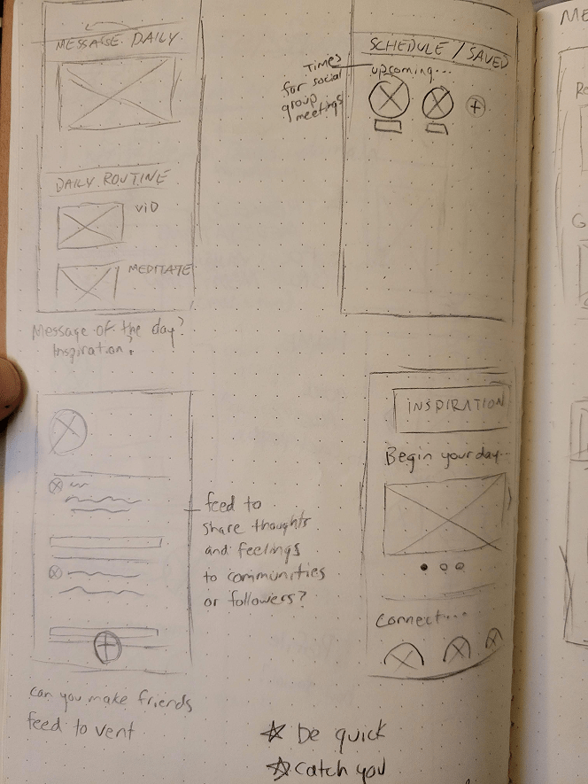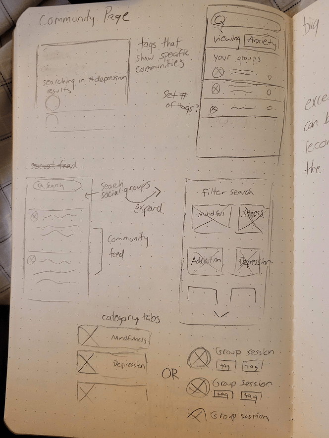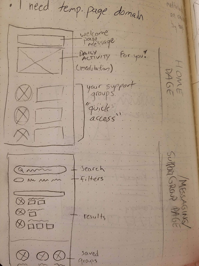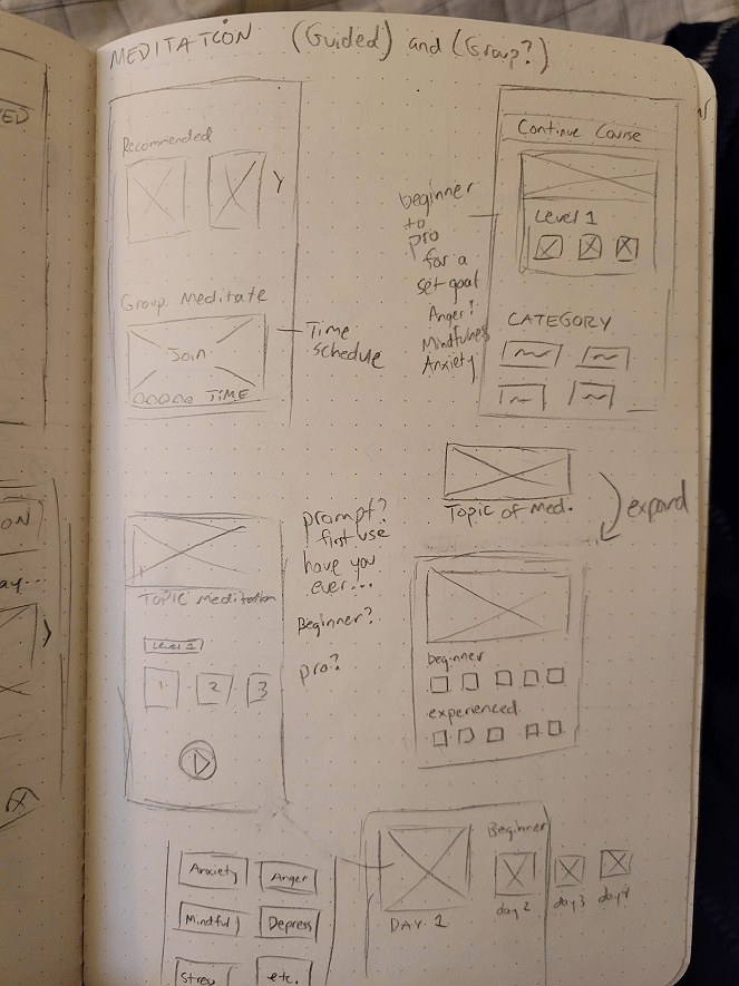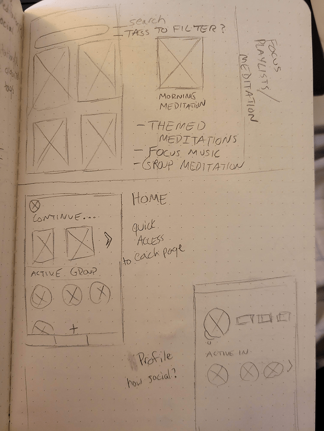 Features I wanted to include would be guided meditations, social groups relating to an illness or topic, ways to organize and track meditation playlists, a form upon sign-up that generates content on your feed upon completion.