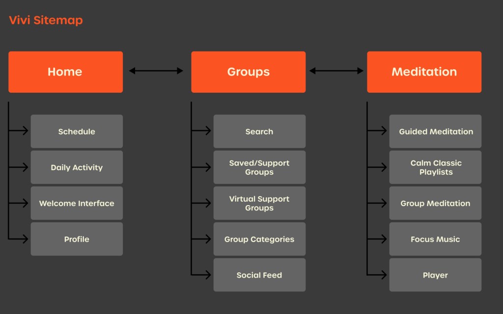 Through conducting competitor research and analysis, I found Headspace and Reddit were the closest to what I wanted Vivi to be. Headspace was also a wellness app that was locked behind paywalls but offered great guided meditation. Reddit can be unreliable and full of distrustful or malicious people but has a good structure to how it handles sub-groups. Taking on the best and removing the worst from these apps I gathered pain points and opportunities to grow Vivi.